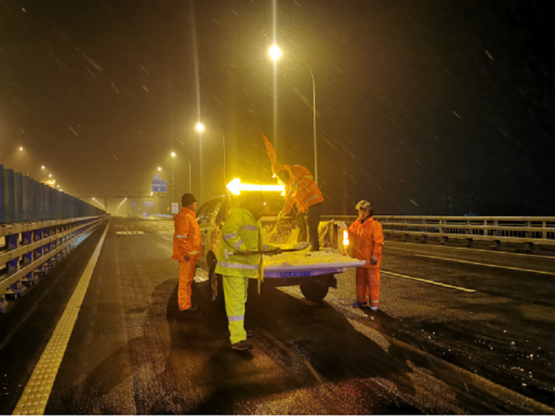 28日夜間,隨著雪勢的增大,監(jiān)控中心密切關注天氣變化情況,及時發(fā)布路況信息,第一時間通報路面積雪情況,并用擴音設備提醒過往車輛謹慎駕駛,減速慢行。路巡組增加道路巡查頻次,對轄區(qū)路段加強警戒,保障清雪作業(yè)路段道路安全暢通。同時,除雪組及時組織力量對積雪結(jié)冰路段實施融雪除冰處置措施,全力開展除雪保通工作,針對易打滑、陡坡、急彎、伸縮縫等特殊路段進行拋灑融雪劑,引導車輛緩慢通行,全力以赴除雪保通。