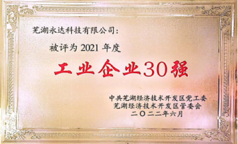 2022年6月9日下午,在蕪湖經(jīng)濟技術(shù)開發(fā)區(qū)管委會一樓多功能廳,蕪湖永達科技有限公司在“蕪湖經(jīng)濟技術(shù)發(fā)開區(qū)2022年度企業(yè)發(fā)展大會”上,榮獲“蕪湖經(jīng)濟技術(shù)開發(fā)區(qū)2021年度工業(yè)企業(yè)30強”榮譽稱號。