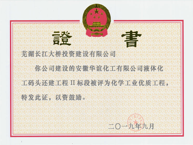 日前,由我公司建設(shè)的安徽華誼化工有限公司液體化工碼頭還建工程Ⅱ標(biāo)段項目,被中國化工企業(yè)施工協(xié)會評為化學(xué)工業(yè)優(yōu)質(zhì)工程。